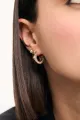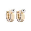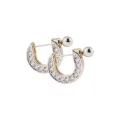 Brinco Smooth é composto por duas partes: um brinco fixo de esfera com pino e uma tarraxa embutida em formato de U, que cria um efeito transpassado ao se conectar ao pino. Além disso, o brinco combina diferentes banhos e texturas: a esfera fixa é prata, o centro da tarraxa é dourado, em metal liso, e as laterais, que são cravejadas, têm acabamento prata. (A esfera possui 0,6 de circunferência / a tarraxa tem 1,7 de altura / 0,6 de largura / 1,9 de profundidade).