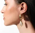 A Argola Olimpo apresenta uma estrutura de metal em formato de meia gota, com acabamento liso e adorno de pérola marroquina em forma orgânica e irregular. (3,0 cm de altura da estrutura metálica / 1,4 cm de largura da estrutura metálica / 2,4 cm de altura da pérola / 1,7 cm de largura da pérola).Todas nossas peças são folheadas a Ouro 18k e Ródio Branco e passam por um processo antialérgico.